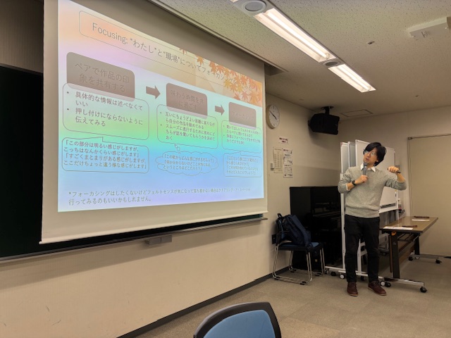 午後は、今回のテーマである「対話」について、考えや感じているものを伝え合うことと定義。フォーカシングを知ることで、自分の考えや感じを明確化できて相手にも寄り添えるので、「対話」を促進できると述べました。